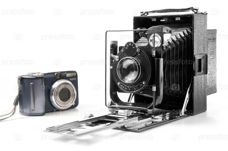 Старая и современная фотокамеры на белом фоне