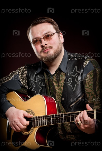 Человек с гитарой на темном фоне
