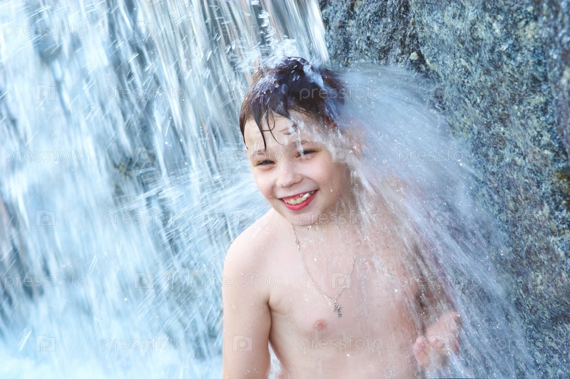 Мальчик под струей воды, жара