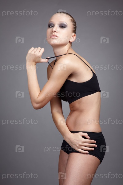Красивая молодая девушка позирует в черном белье на сером фоне