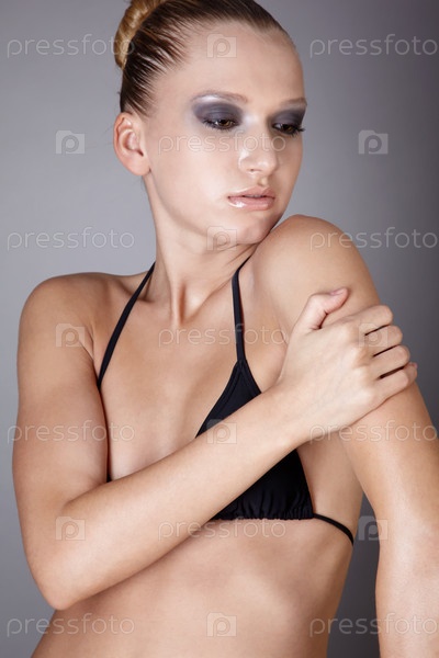 Портрет красивой молодой девушки, которая позирует в черном купальнике на сером фоне