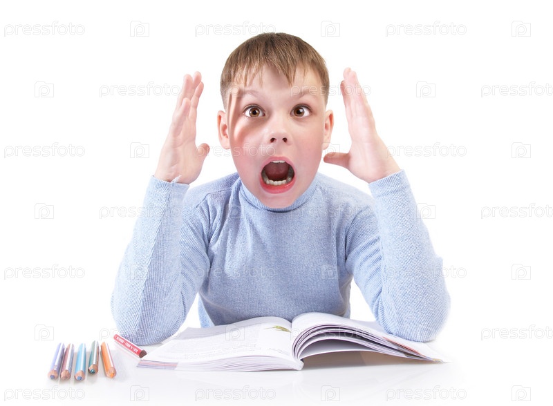 Эмоциональный мальчик с книгой за столом на белом фоне