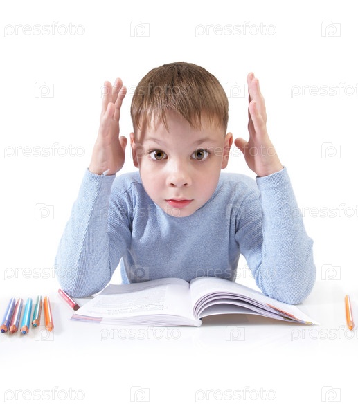 Эмоциональный мальчик с книгой за столом на белом фоне