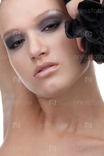 Портрет красивой молодой девушки с ярким макияжем и черным цветком