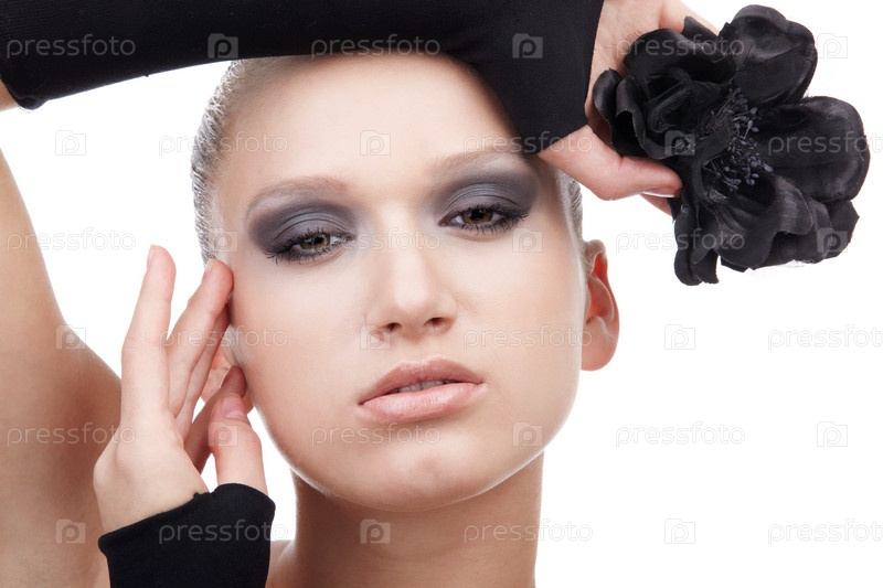 Портрет красивой молодой девушки с ярким макияжем и черным цветком