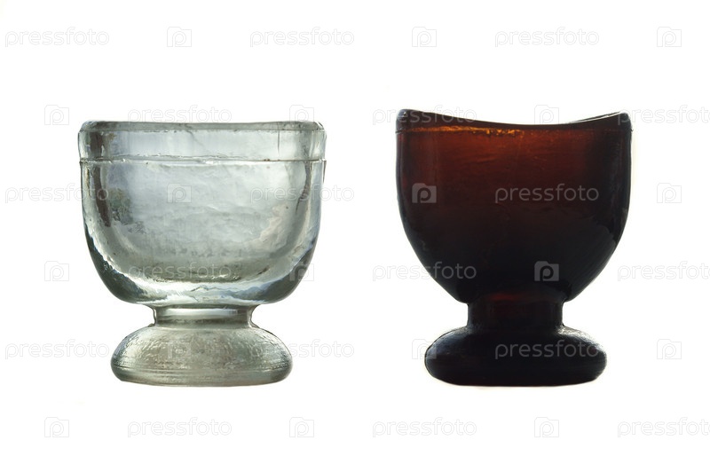 Рюмки из стекла разного цвета для промывания глаз на белом фоне