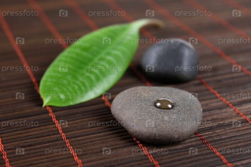 Камни для спа-салона с зеленым листом на бамбуковом салфетке удалены вблизи