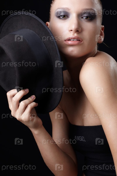 Портрет красивой молодой девушки, которая позирует со шляпой на черном фоне