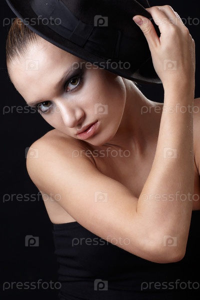 Портрет красивой молодой девушки, которая позирует со шляпой на черном фоне