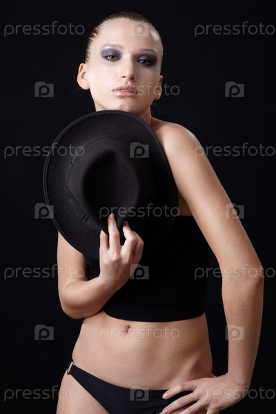 Красивая молодая девушка, которая позирует со шляпой на черном фоне