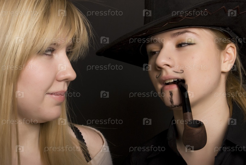 Девушка в костюме джентльмена с трубкой и привлекательная блондинка