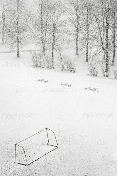 Школьное футбольное поле во время снегопада