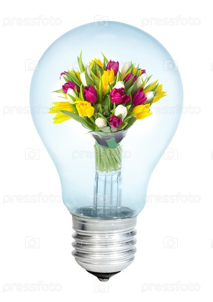 Электрическая лампочка с букетом тюльпанов на белом фоне