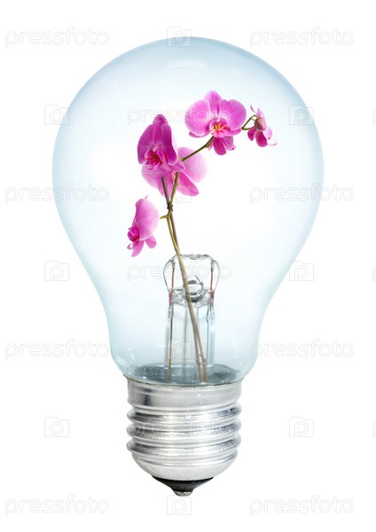 Электрическая лампочка с орхидеями на белом фоне