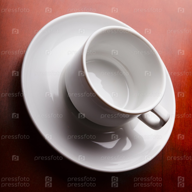 Пустая белая чашка с блюдцем на деревянной поверхности