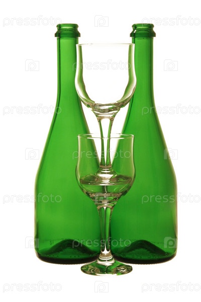 Зеленые бутылки и бокалы на белом фоне