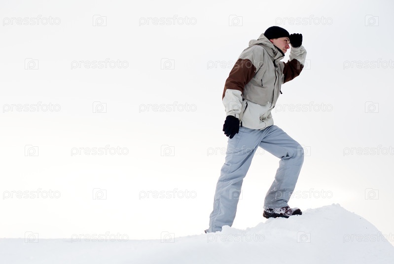Молодой человек стоит на вершине горы