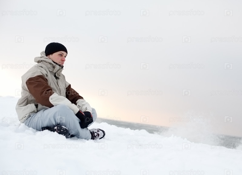 Молодой человек сидит на снегу, на берегу зимнего моря