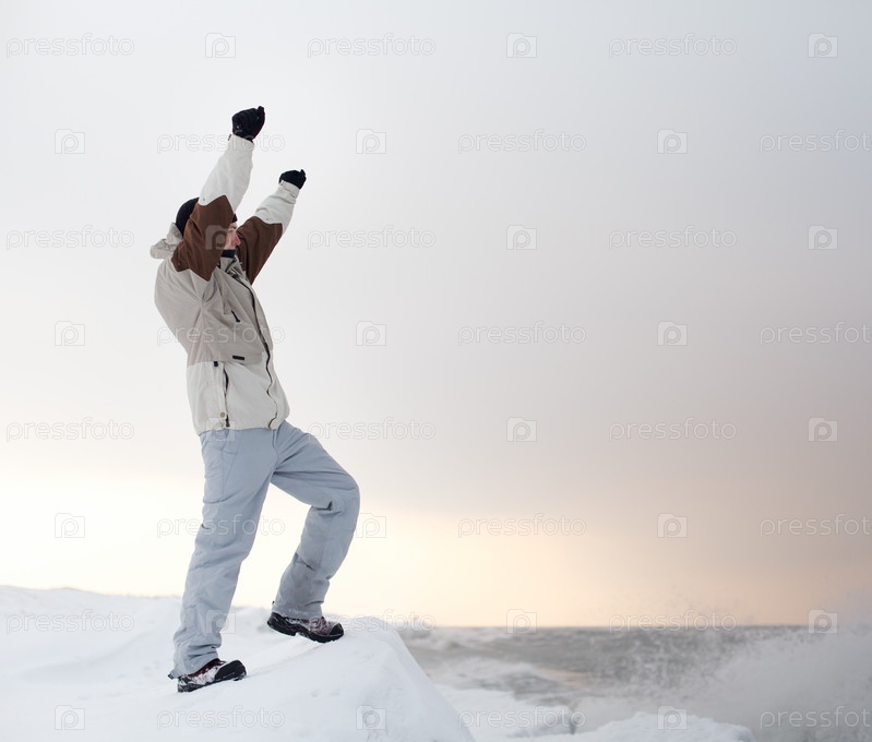 Молодой человек стоит на льду, на берегу зимнего моря