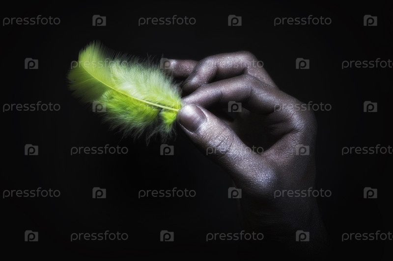 Мужская рука в серебряной краске с зеленым пером