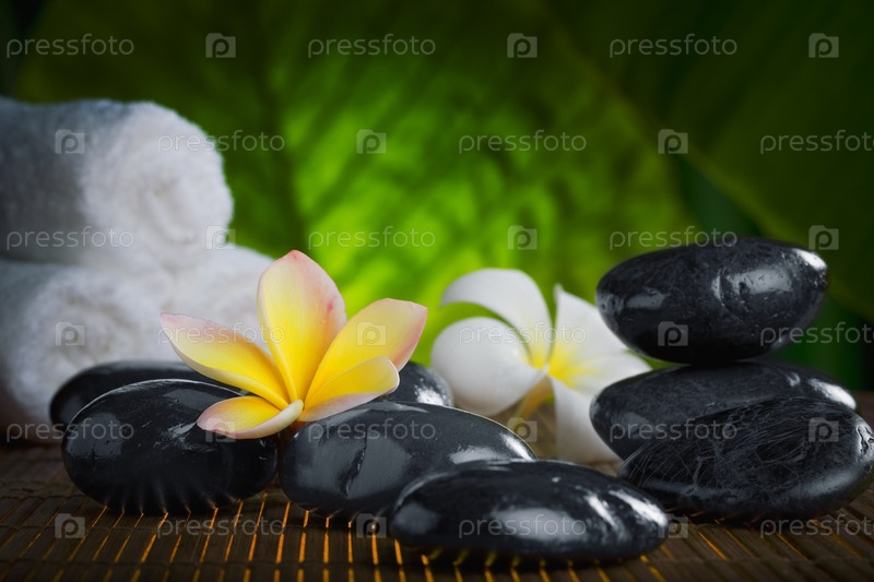 Камни для массажа, полотенце и цветы