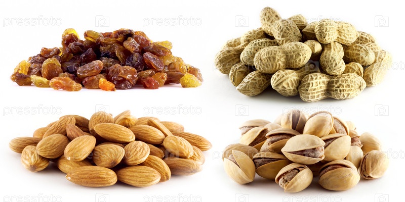 Изюм и орехи на белом фоне