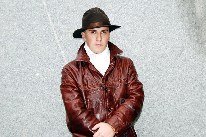 Мужчина в кожаной куртке и шляпе на сером фоне