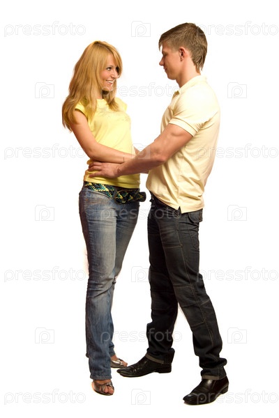 Молодая влюбленная пара на белом фоне
