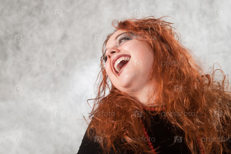 Рыжеволосая молодая женщина смеется, запрокинув голову