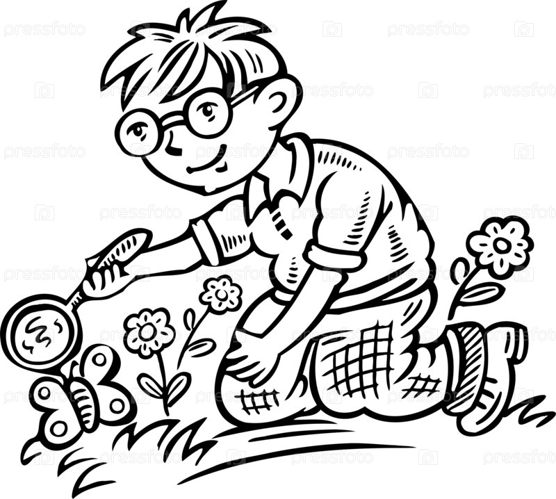 Мальчик изучает бабочку через лупу