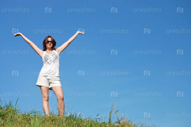 Молодая девушка, стоящая на зеленом лугу на фоне голубого неба