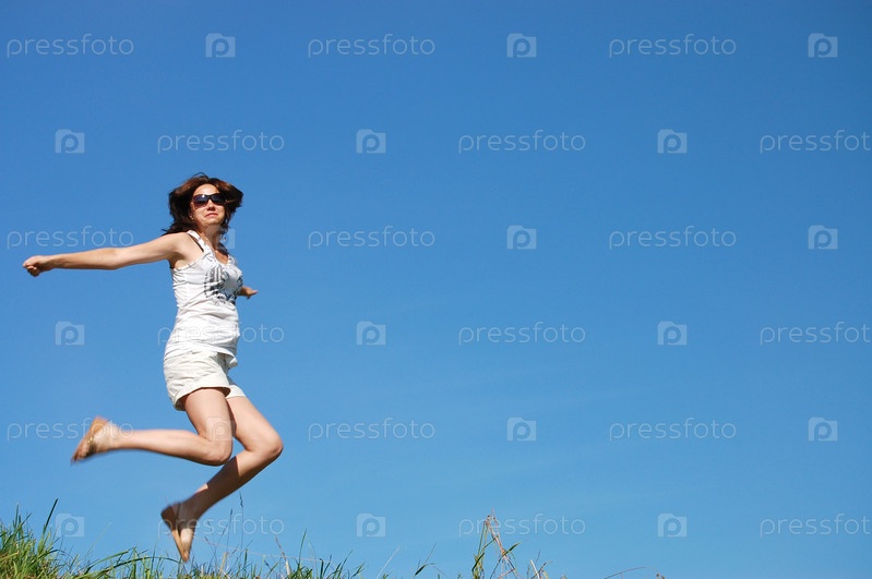 Молодая девушка, прыгающая на зеленом лугу на фоне голубого неба