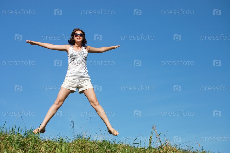 Молодая девушка, прыгающая на зеленом лугу на фоне голубого неба