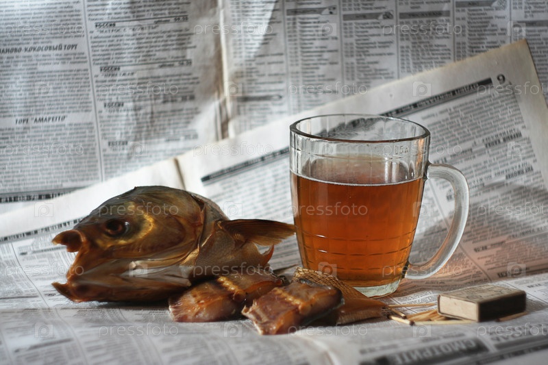 Пиво с рыбой на газете