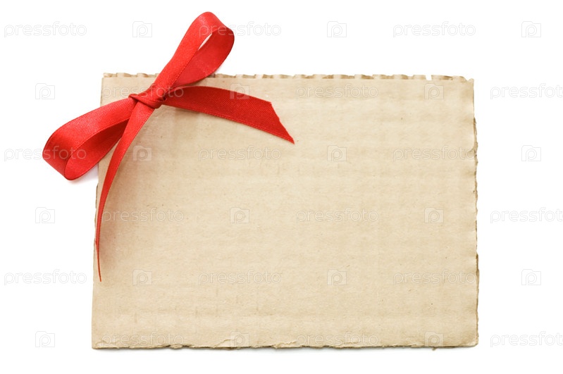 Картонка с бантиком из атласной ткани на белом фоне