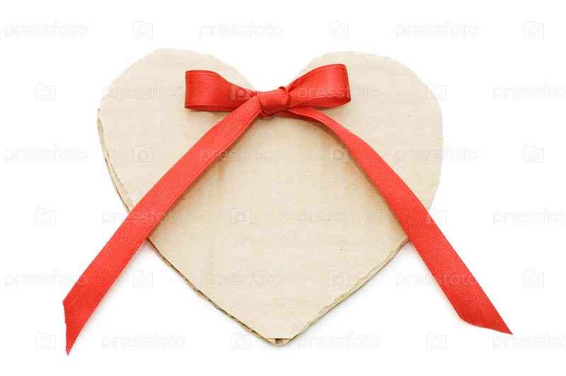 Картонка в форме сердца с бантиком из атласной ткани на белом фоне
