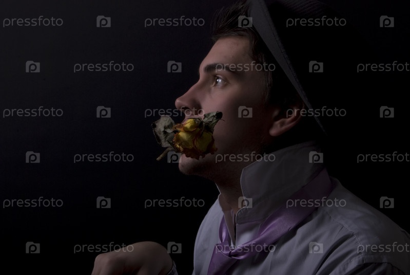 Грозный молодой человек с розой на черном фоне