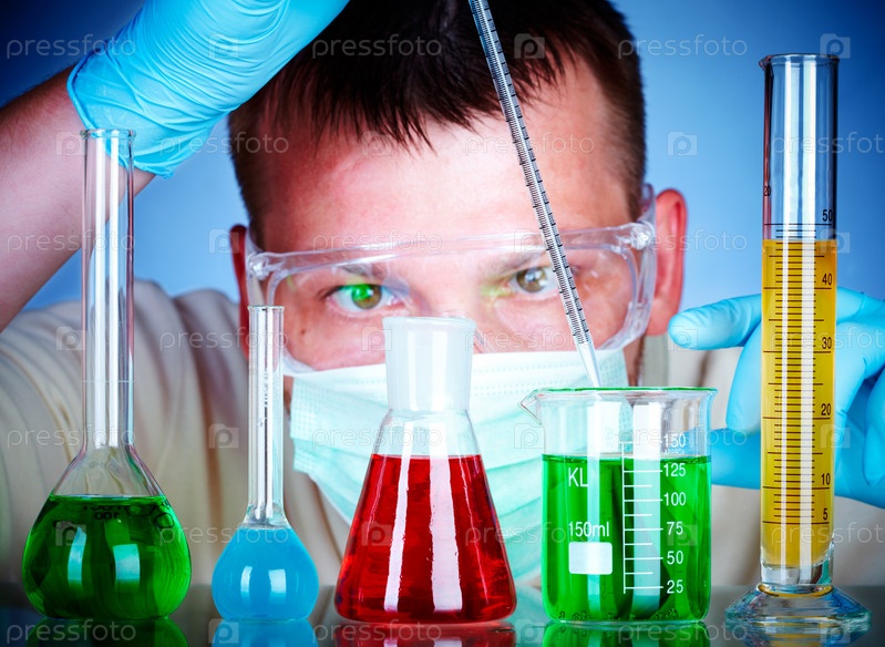 Ученый в лаборатории с колбами