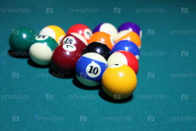 Разноцветные бильярдные шары лежат треугольником на бильярдном столе