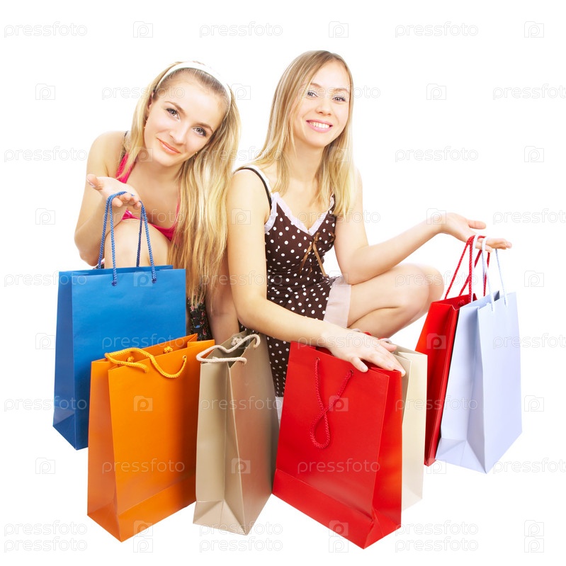 Две девушки с пакетами на белом фоне