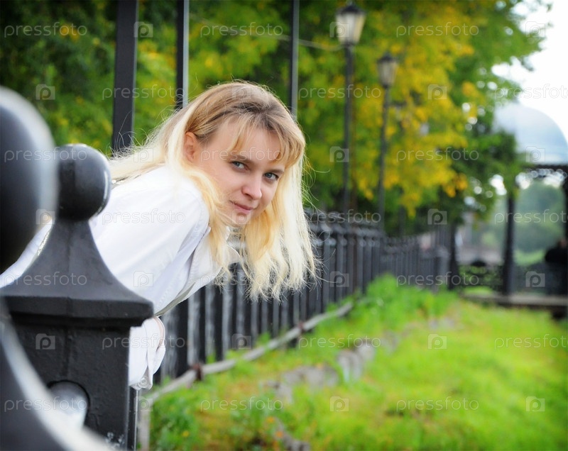 Красивая блондинка в пальто ходит вокруг перила, причала
