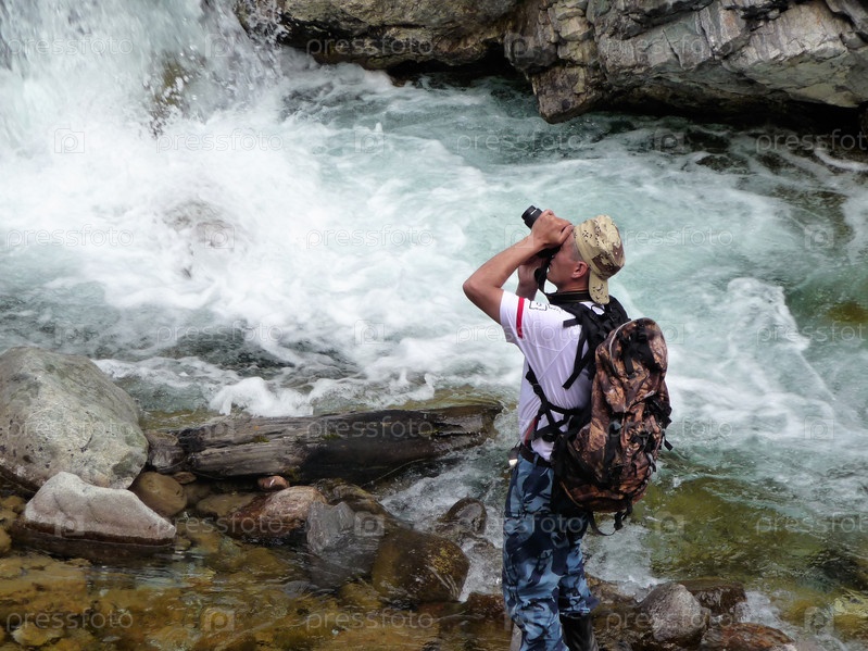 Турист фотографирует водопад в горах Тункинских Гольцов