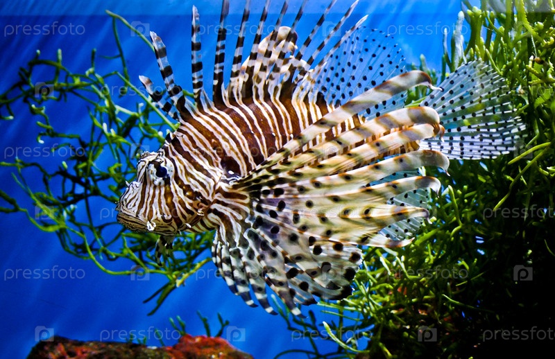 Яркая экзотическая рыба на фоне морской воды и водорослей