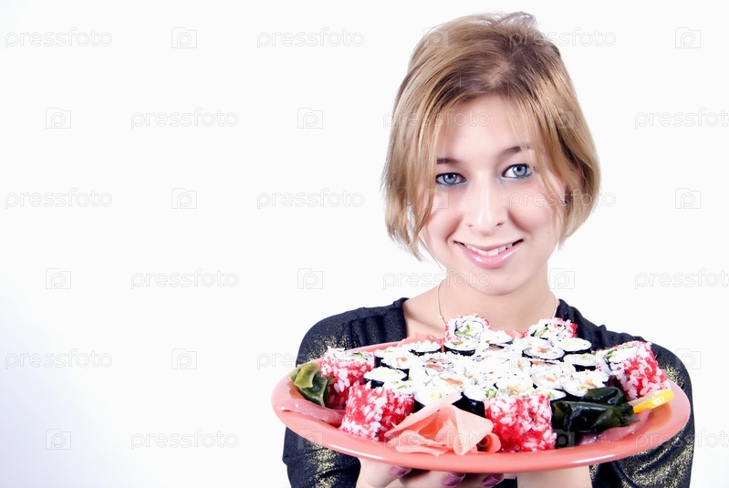 Привлекательная девушка с аппетитным набором суши