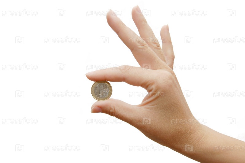 Монета в женской руке на белом фоне