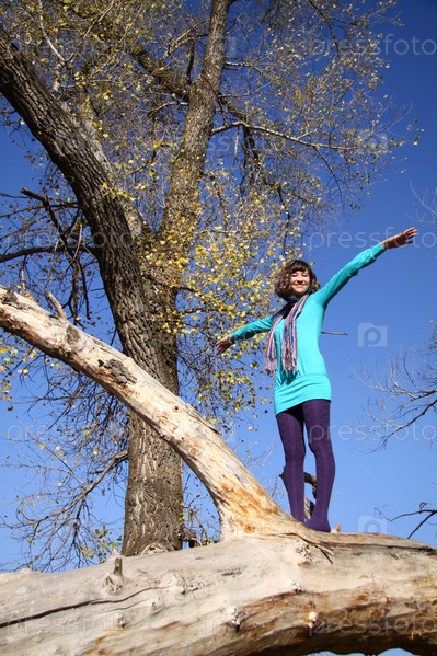 Красивая девушка стоит на стволе дерева