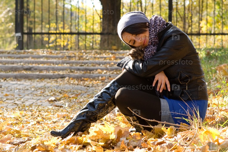 Привлекательная брюнетка с котенком в осеннем парке