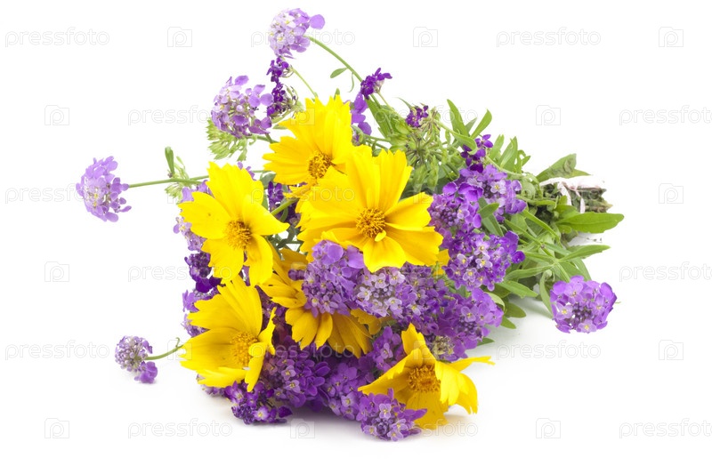 Букет из сирени и маргариток на белом фоне