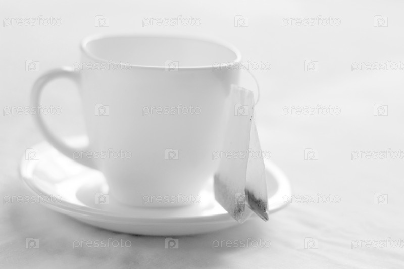 Белая чашка на блюдце с чайным пакетиком