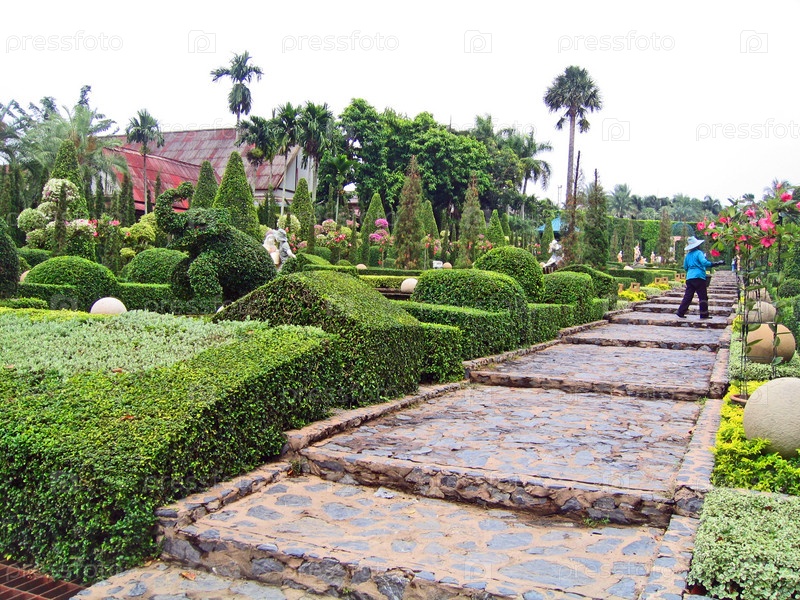 Садовник на дорожке ботанического сада, Паттайя, Таиланд